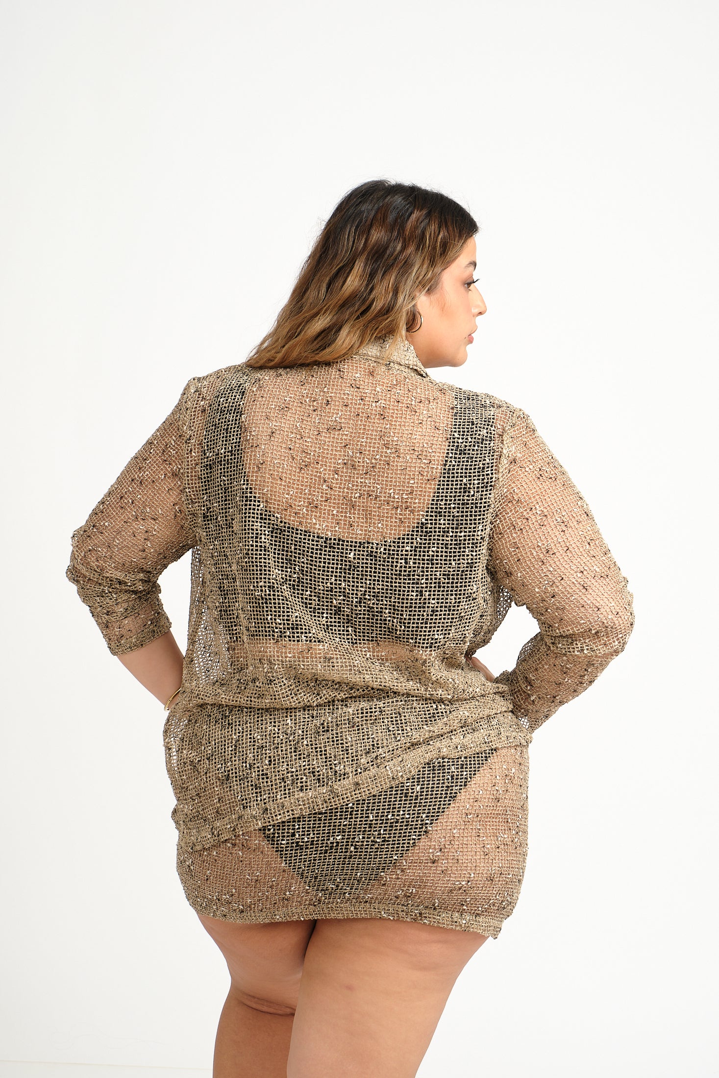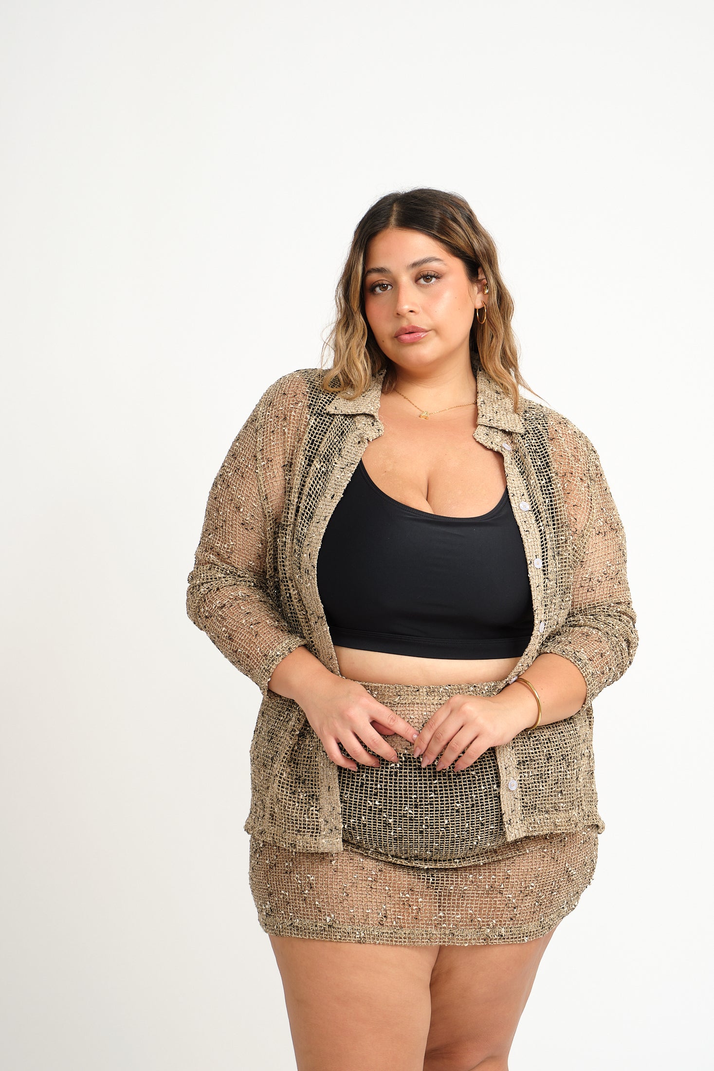 Alexandra (cabello rubio) está usando la talla 2XL y Fátima (cabello oscuro) está usando la talla L.