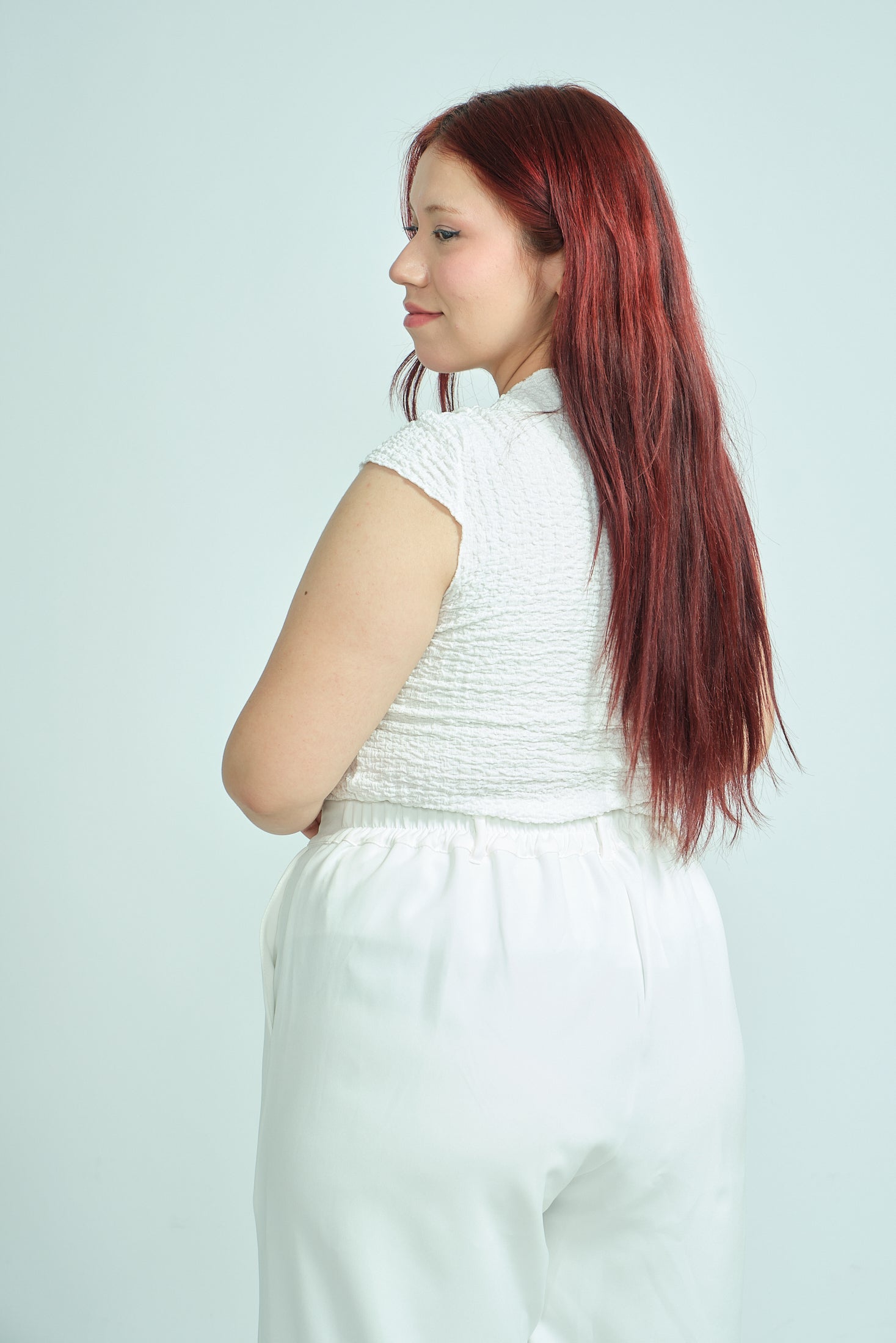 - Pantalón recto en color único, con cierre, botón, precillas y elástico en la cintura