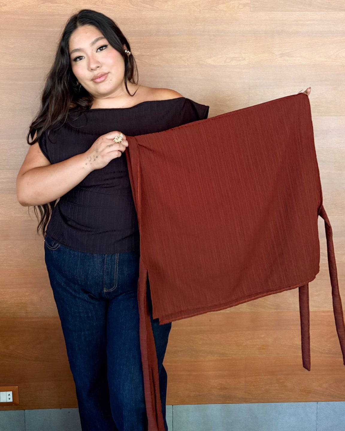 - La blusa viene como una capa con 4 tiras, una a cada lado. Las dos tiras de la espalda se amarran debajo del busto y las otras dos tiras se amarrán hacia la espalda para marcar la cintura.