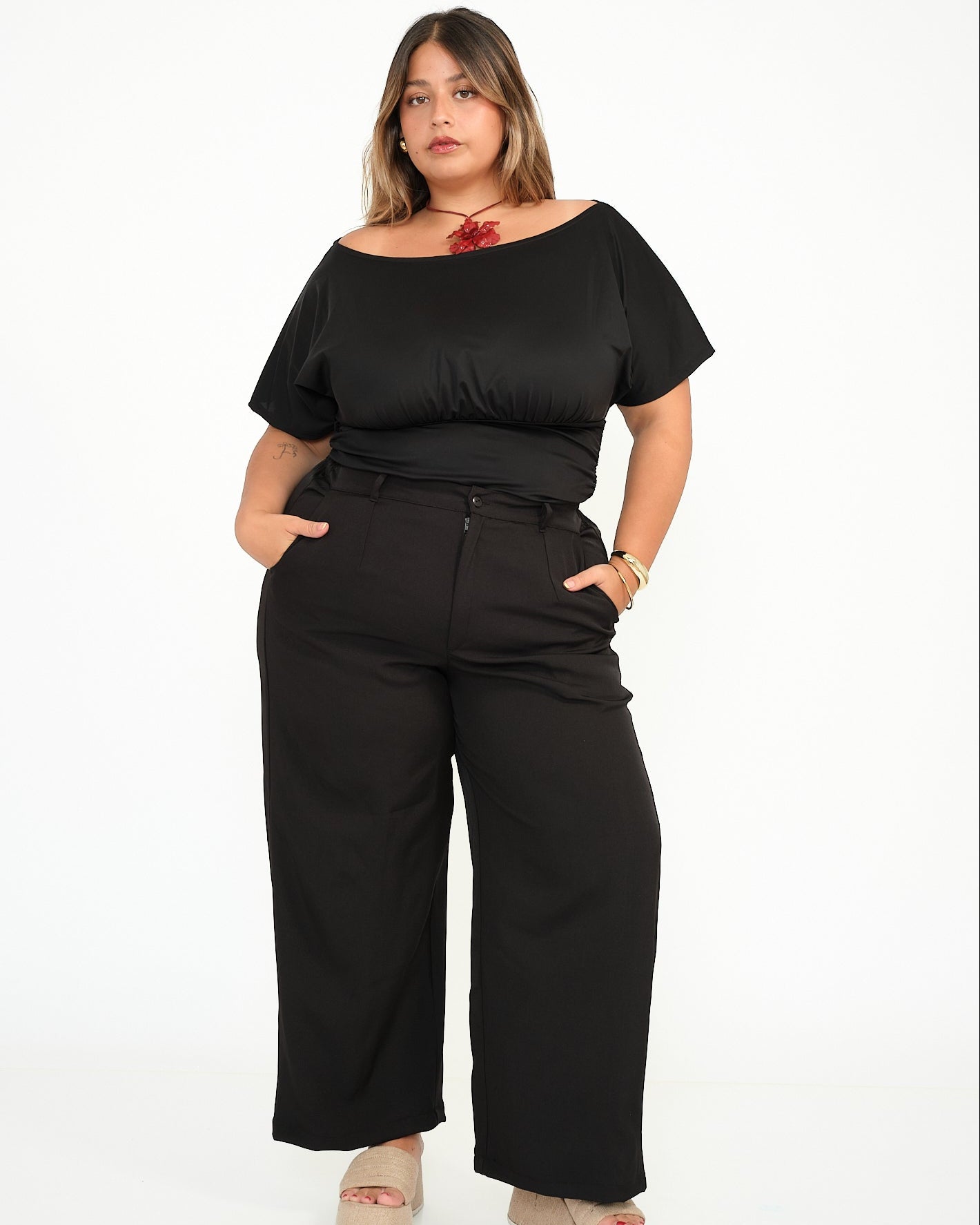 - Elástico en la cintura, cierre y bolsillos