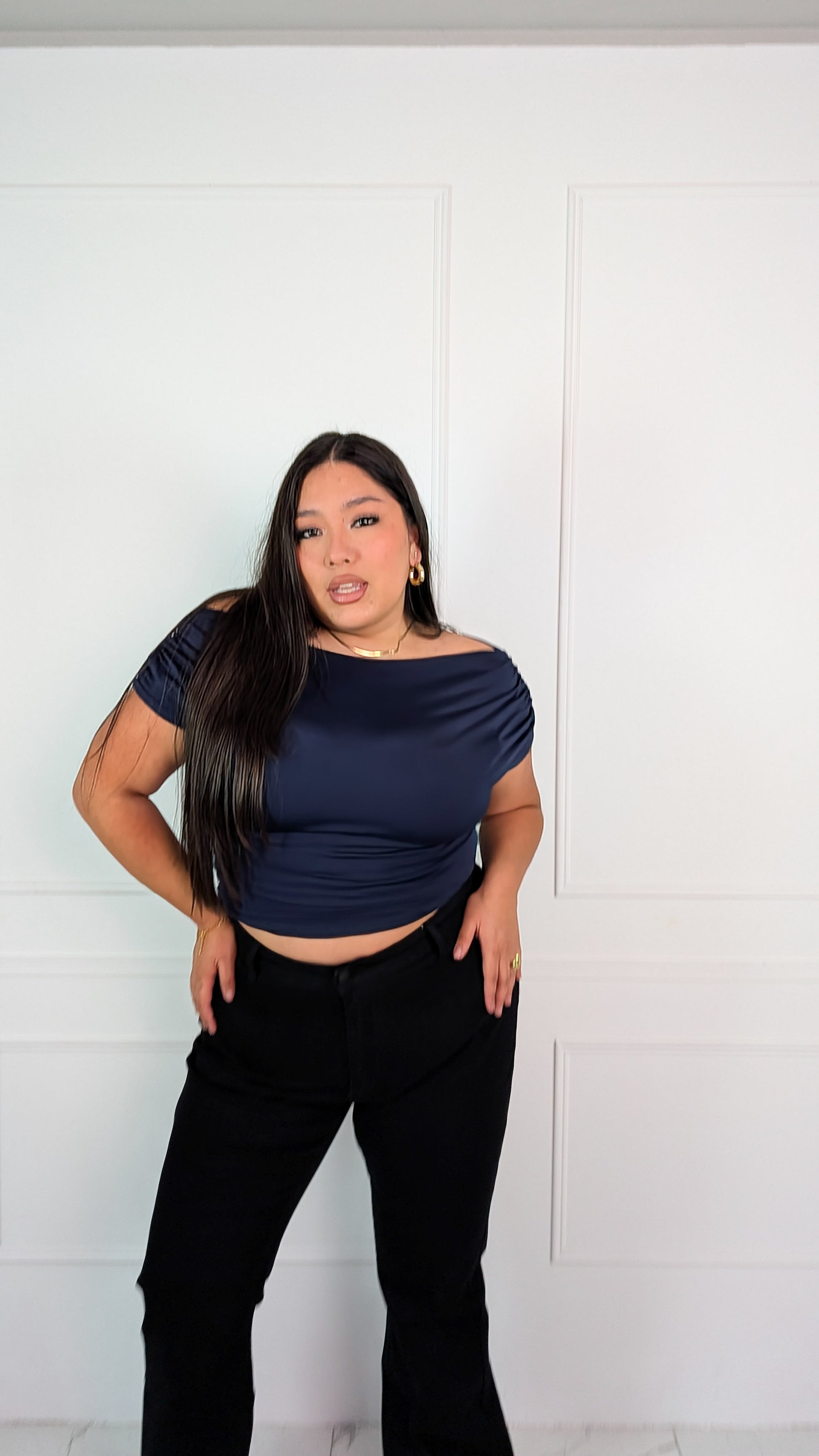 Estefanía está usando el top rojo y sus medidas en busto son de 120 cm y en cintura 106